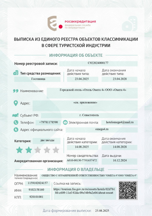 Выписка аккредитации гостиницы Омега 4 две звезды из единого реестра классификации отелей