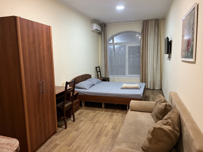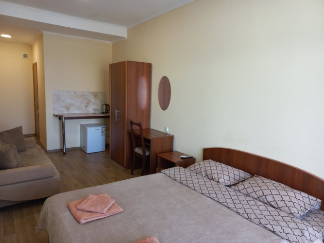 В номерах: одна двуспальная кровать, двуспальный диван, санузел (душевая кабина, умывальник, туалет), холодильник (мини-бар), ТВ (кабельное), чайник, сплит-система, дворик патио, вид на море.